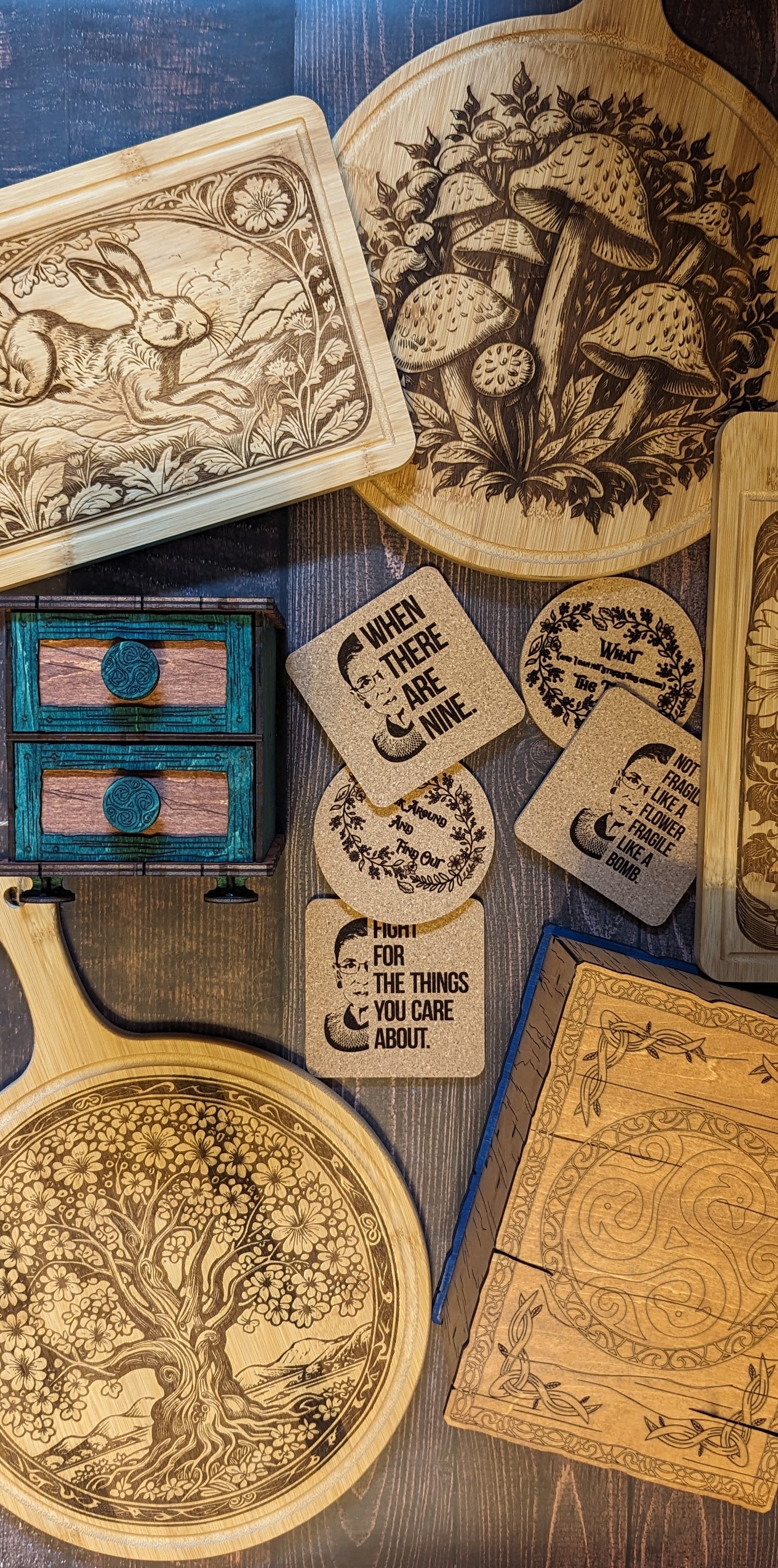 Boxes, charcuterie boards, cork coasters, cutting boards, dollhouse miniatures, keyholders, plant trellises, and more.